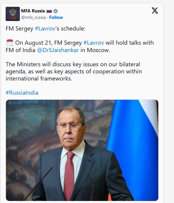 रुसको विदेश मन्त्रालयले सोसल मिडिया प्लेटफर्म एक्समा जानकारी साझा गर्दै भनेको छ, ‘अगस्ट २१ मा, रुसी विदेशमन्त्री सर्गेई लाभरोभले मस्कोमा भारतीय विदेशमन्त्री एस जयशंकरसँग वार्ता गर्नेछन्। जसमा दुई नेताले द्विपक्षीय सम्बन्ध र अन्तर्राष्ट्रिय ढाँचाभित्र सहयोगका प्रमुख मुद्दाहरूमा छलफल गर्नेछन्।’