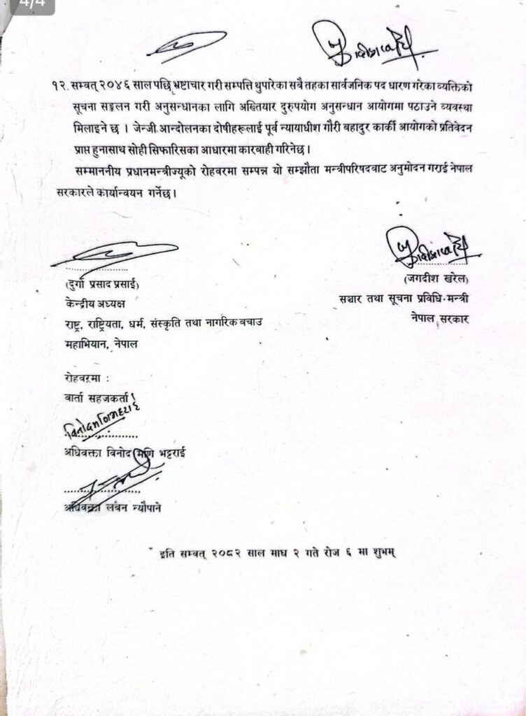 यो हो सरकार र राष्ट्र, राष्ट्रियता, धर्म, संस्कृति र नागरिक बचाउ महाभियानबीच भएको सम्झौता यस्ता छ हुर्नुहोस् !