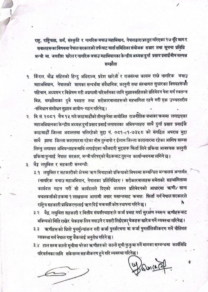 २७ बुँदे माग र सवालका विषयमा नेपाल सरकारका तर्फबाट वार्ता समितिका संयोजक सञ्चार तथा सूचना प्रविधिमन्त्री जगदीश खरेल र महाअभियानका तर्फबाट दुर्गा प्रसाईंले सम्झौतापत्रमा हस्ताक्षर गरेका हुन् ।